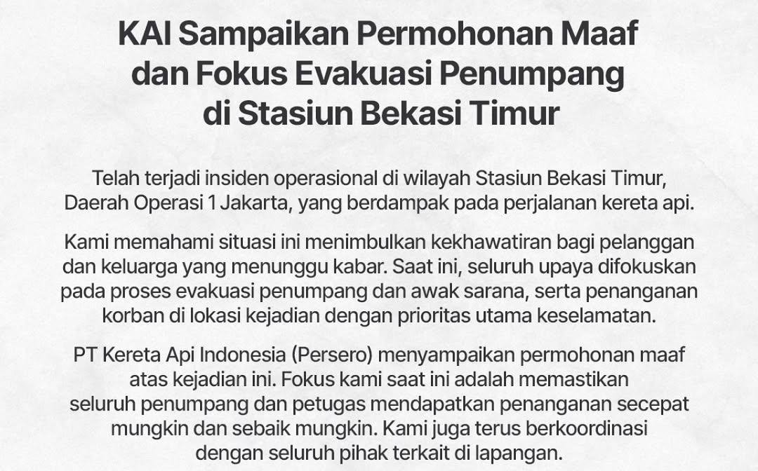 KAI menyampaikan duka mendalam atas kejadian ini. Situasi ini membawa kesedihan bagi pelanggan serta keluarga yang menanti kabar. Saat ini, seluruh upaya difokuskan pada evakuasi dan penanganan korban dengan prioritas utama keselamatan dan kondisi setiap penumpang.
