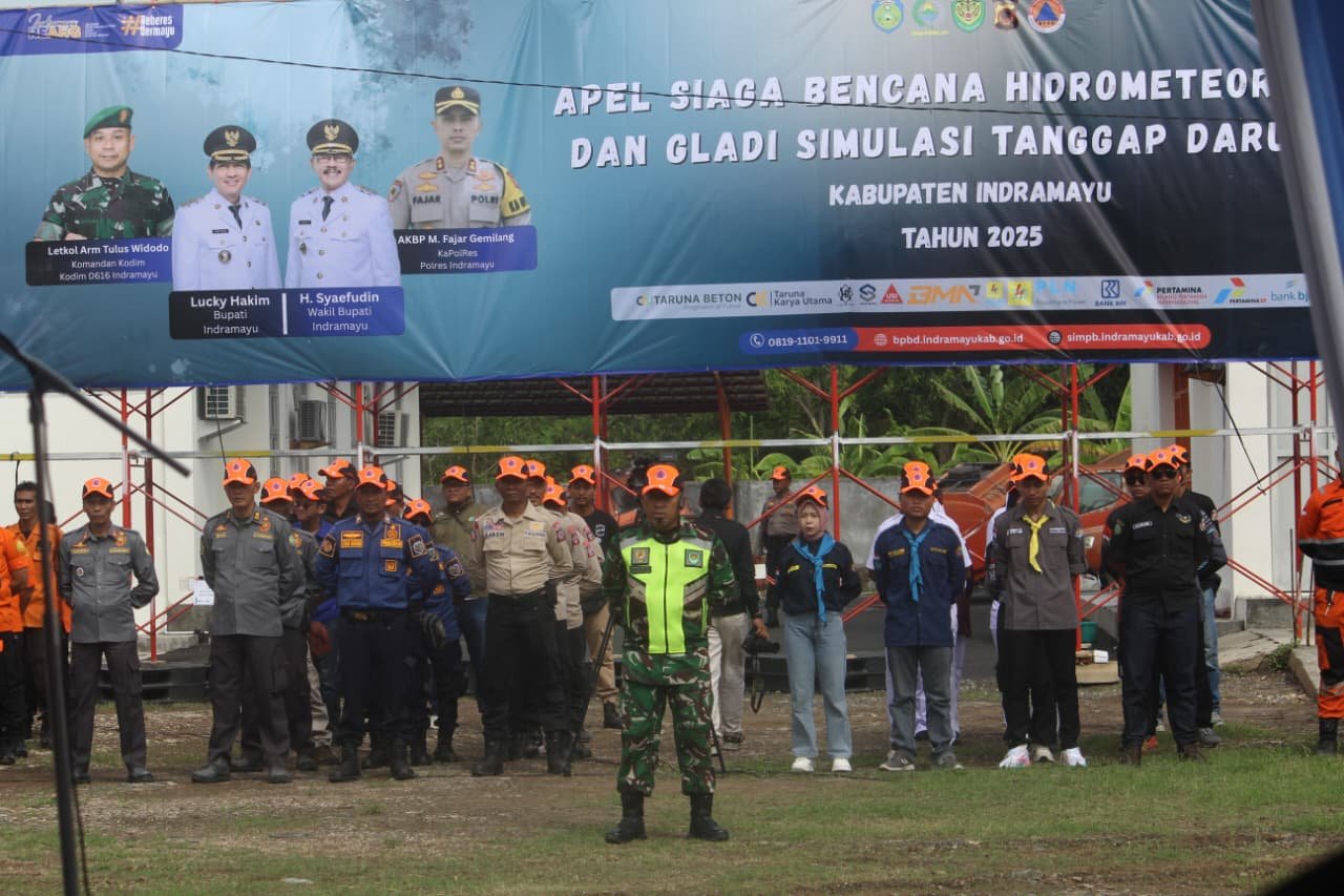 Kerikil.id, Indramayu – Kasdim 0616/Indramayu Mayor Inf Sutarmin menghadiri kegiatan Apel Siaga Bencana Hidrometeorologi dan Gladi Simulasi Tanggap Darurat Tahun 2025 yang digelar di halaman Kantor BPBD Kabupaten Indramayu, Jl. Pahlawan No.62/A, Kelurahan Lemahmekar, Kecamatan Indramayu, Rabu (12/11/2025).