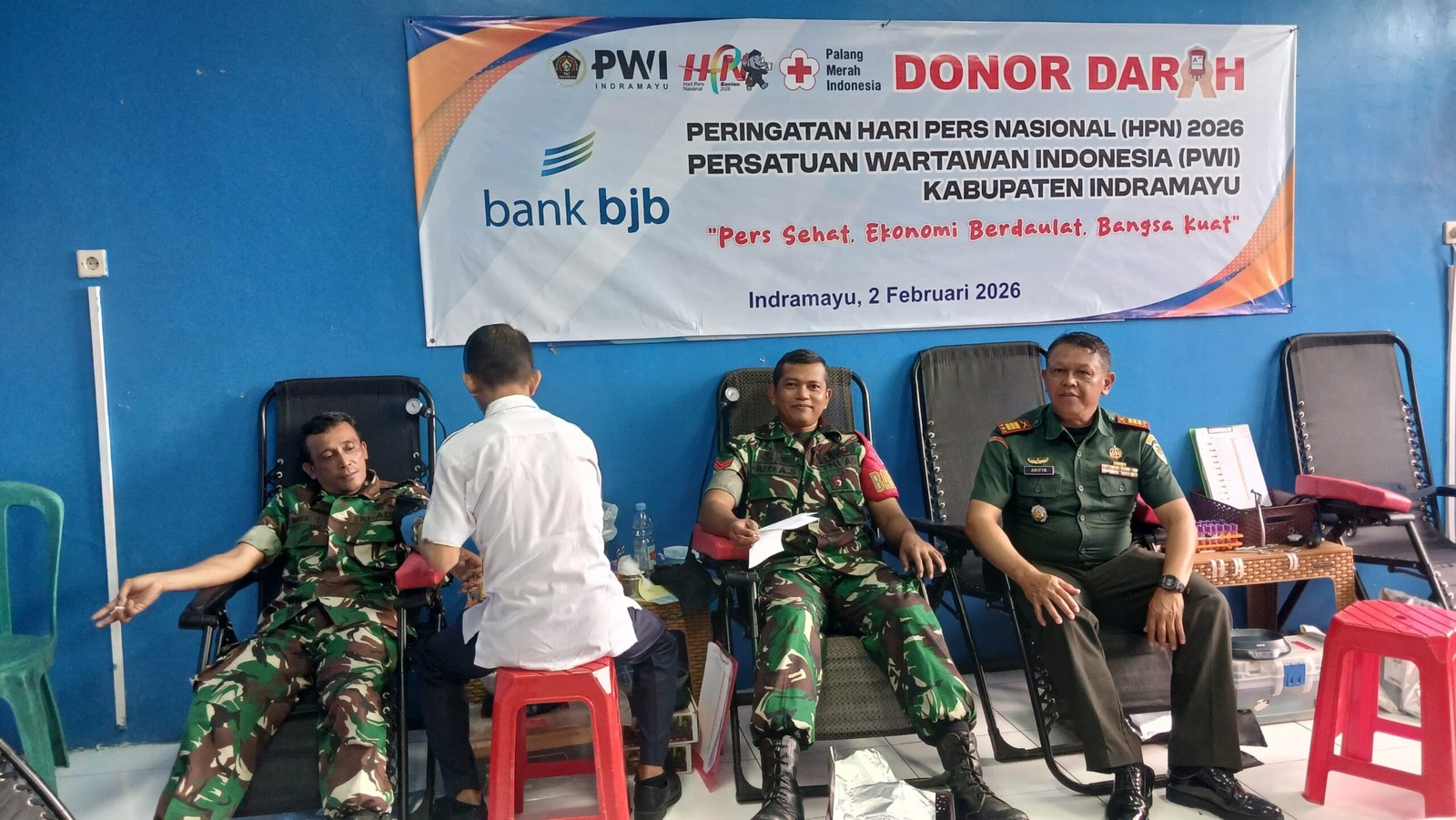 Kerikil.id, Indramayu – Anggota Kodim 0616/Indramayu melaksanakan bakti sosial donor darah dalam rangkaian peringatan Hari Pers Nasional (HPN) Tahun 2026 dan Hari Ulang Tahun Persatuan Wartawan Indonesia (PWI) ke-80 yang mengusung tema “Pers Sehat, Ekonomi Berdaulat, Bangsa Kuat”. Kegiatan dilaksanakan di Sekretariat PWI Indramayu, Senin (2/2/2026).