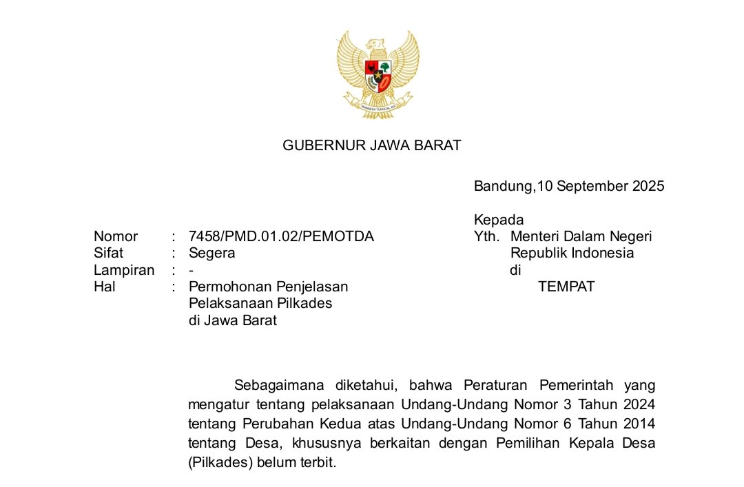 Kerikil, Bandung – Gubernur Jawa Barat, Dedi Mulyadi, menegaskan sudah mengirimkan surat permohonan penjelasan pelaksanaan Pilkades di Jawa Barat pada tahun 2025 kepada Menteri Dalam Negeri Tito Karnavian, Rabu (10/9/2025).