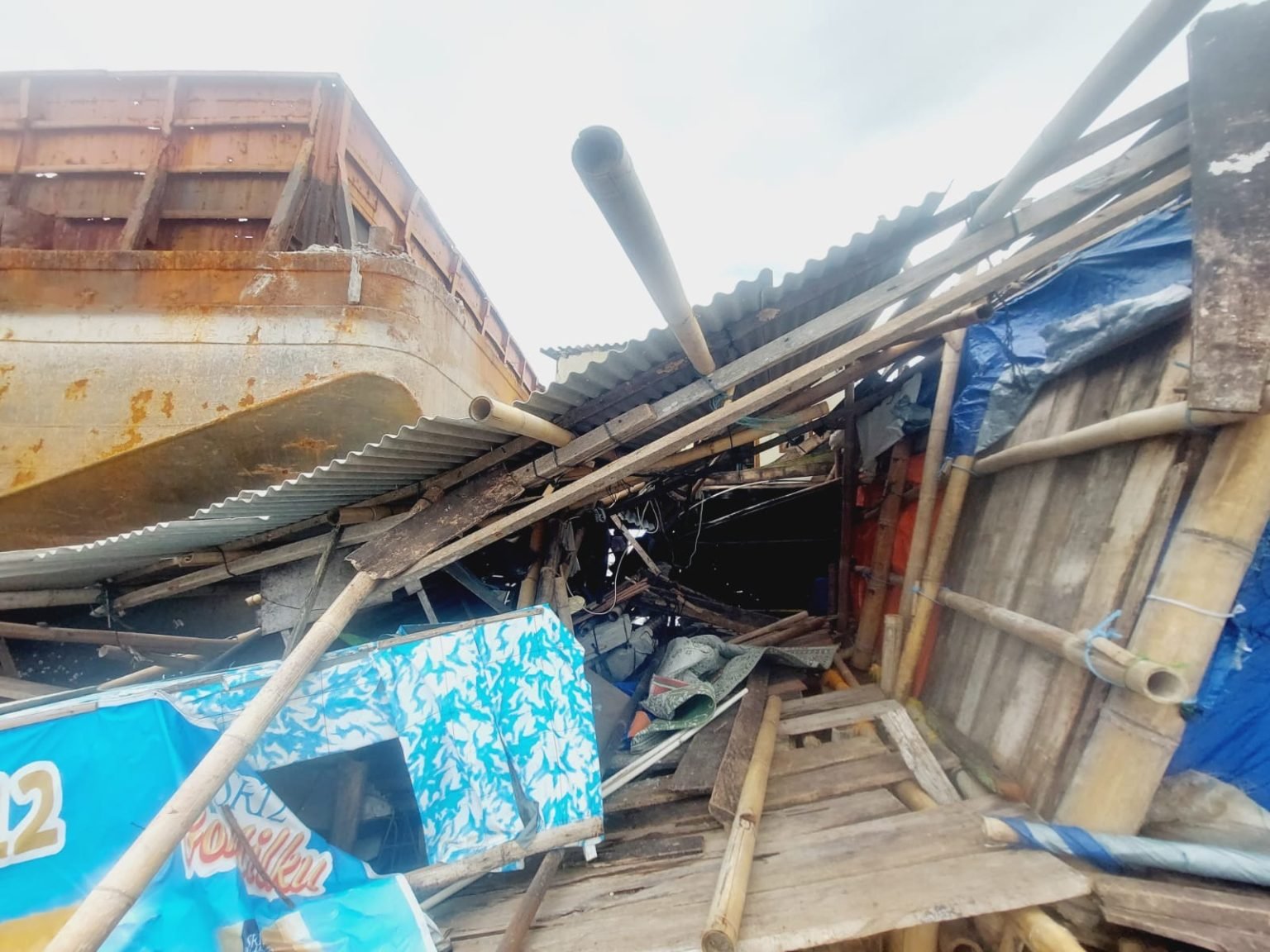 Dampak benturan juga dirasakan warga sekitar. Rumah milik Masrul dilaporkan roboh sebagian, sementara beberapa rumah lainnya mengalami retakan akibat getaran keras saat tongkang menghantam daratan.